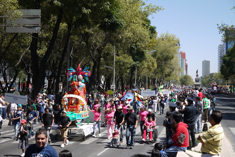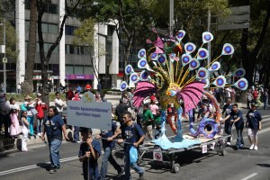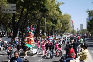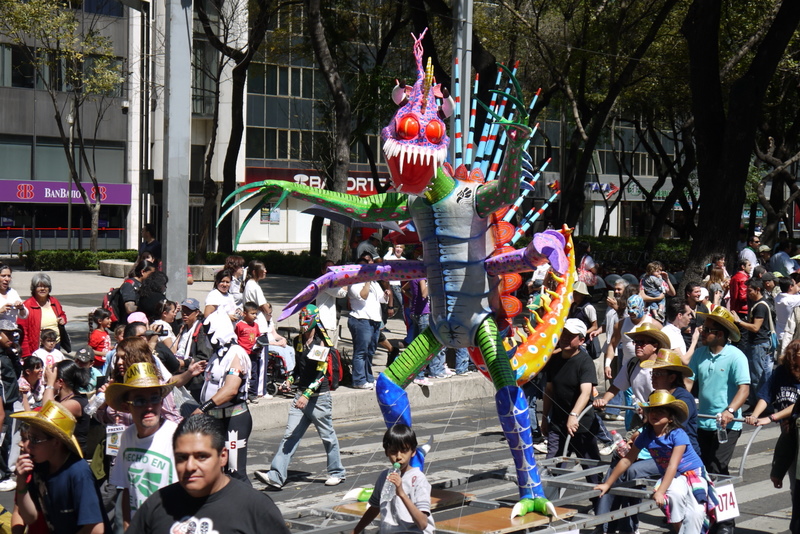 メキシコ市内の目抜き通りレフォルマでパレードがありました。エグい色をした怪獣の山車が次から次へと練り歩いています。